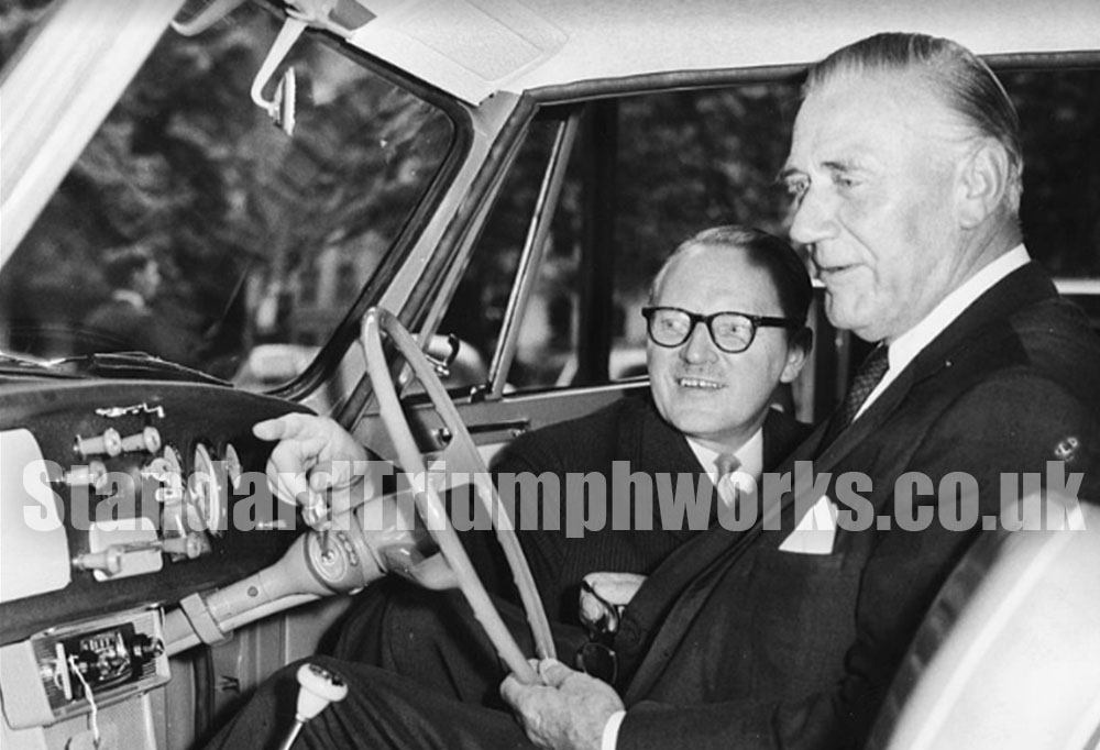Seen here (left) instructing Val Parnell, actor and impresario upon delivery of his brand new Triumph Herald.