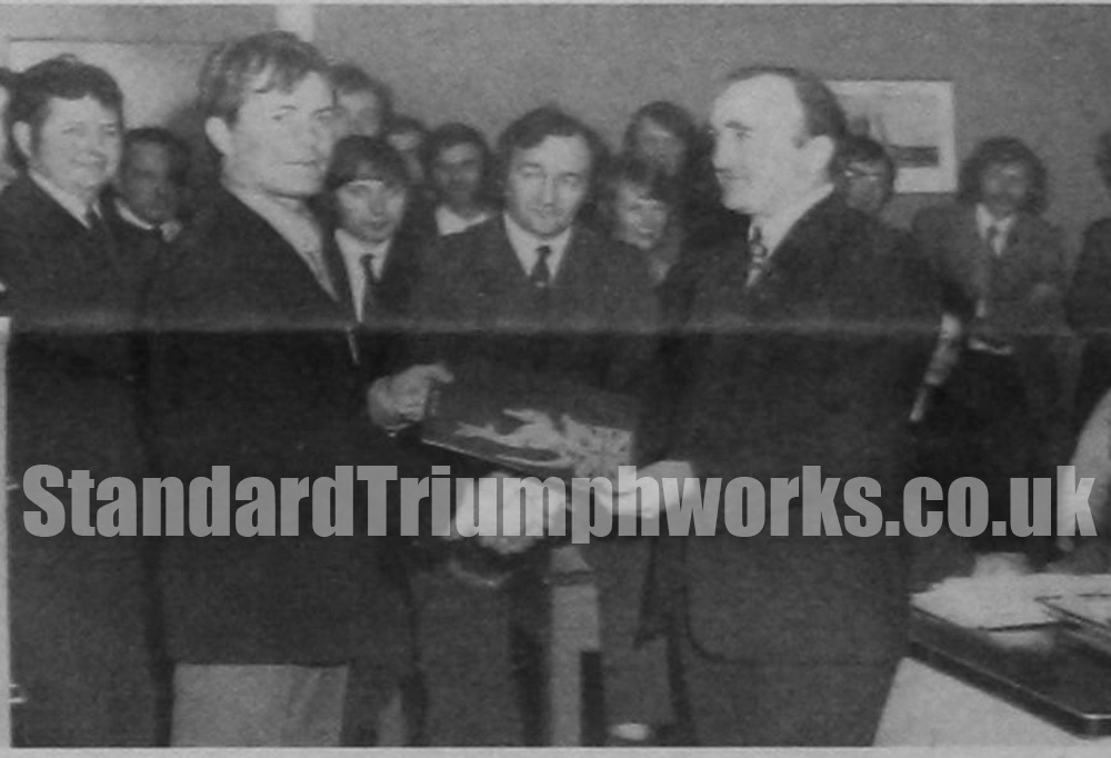 Chris had served in our Engineering department for seven years. On behalf of colleagues Bill Clarke, assistant Chief Materials Engineer, presented a document case, slide rule, tools, and a model kit.