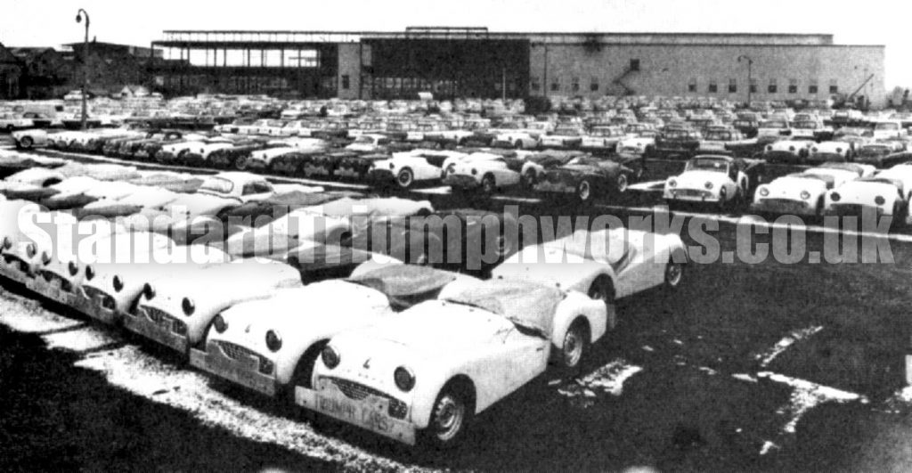 The foreground shows export TR’s with their wooden boards to protect them during shipping and snow! Can we date this photo to winter 1960 – was there early snow in the winter of 1960/61? Was the new Assembly Hall finished from this photo (it came on-line very early January 1961) so with the cladding yet to be finished – and we assume not watertight – was this photo actually from the winter of 1959/60? More research required!