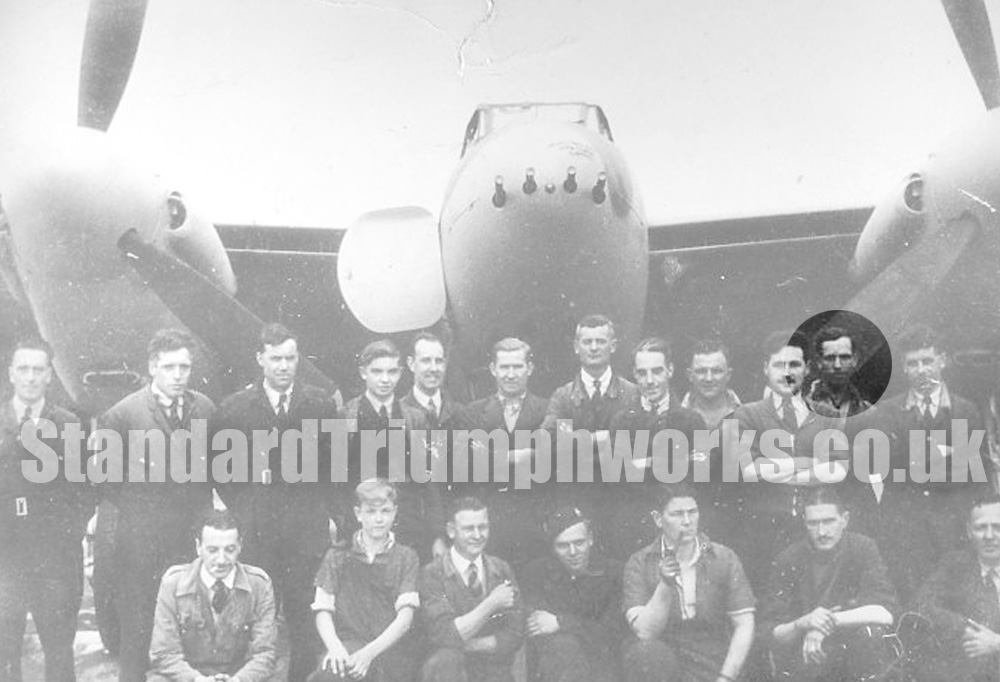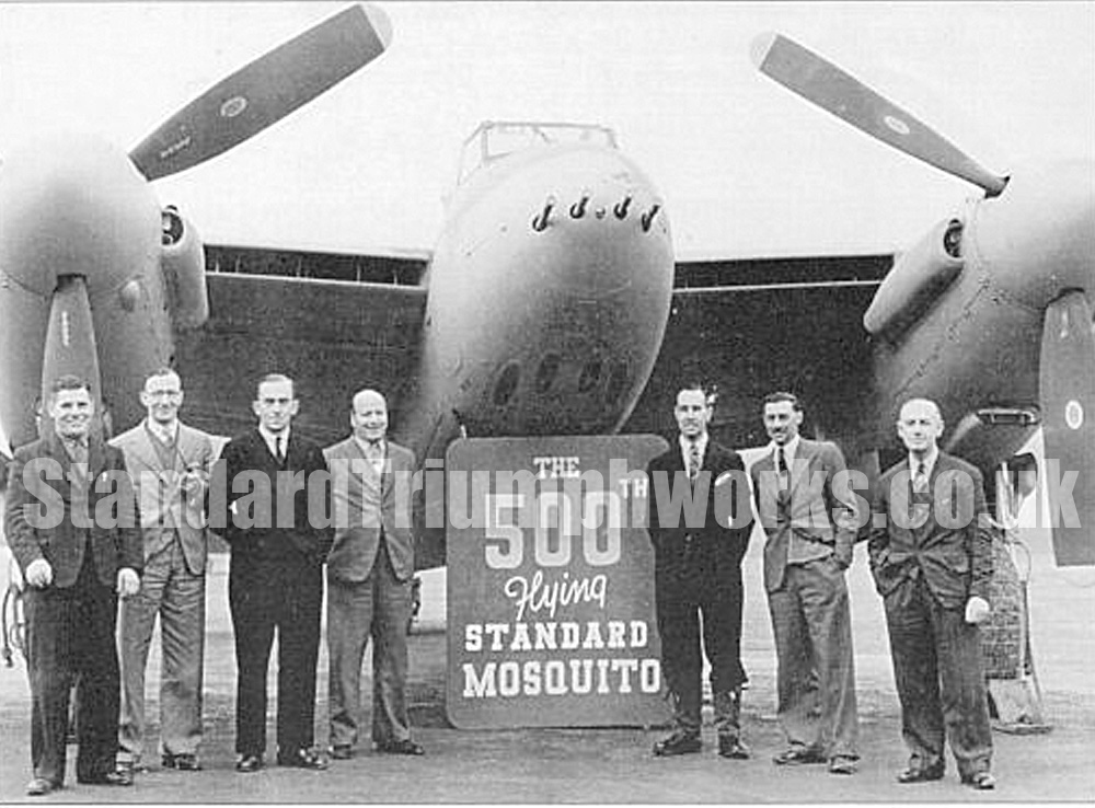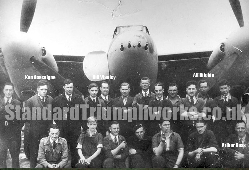 The photograph showing a group of workers in front of a de Havilland Mosquito was taken at the Standard Motors Facility at Ansty. Standard Motors were contracted to produce Mosquitos and Airspeed Oxford Aircraft during WW2. The original photo, and more details about the Mosquito, can be seen HERE.