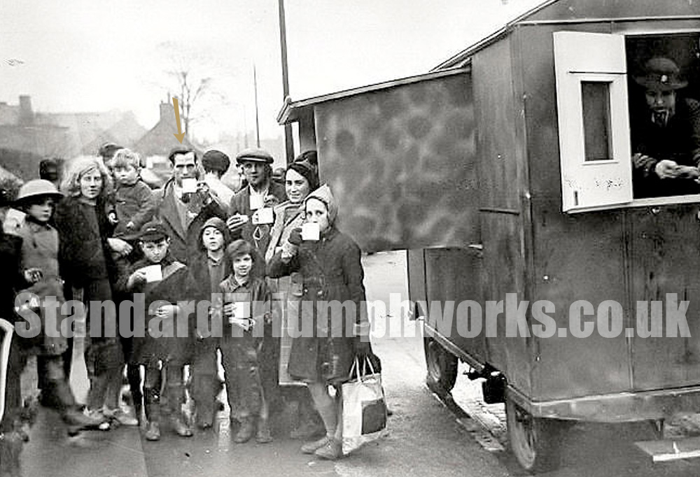 In both images (above) we now have a postive identification of Alf Hitchin, who worked at the Standard works. On the second photo, dated immediately after the Coventry Blitz, Alf can be seen enjoying a cup of tea from a mobile tea wagon.