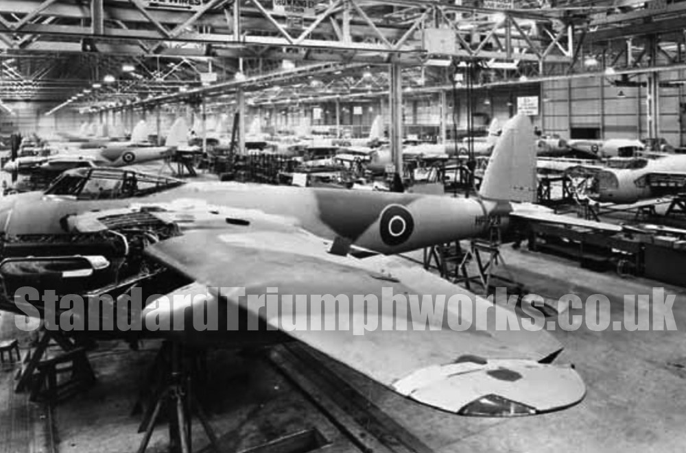 The Standard Motor Company Ltd, had produced excellent quality cars before the war, and was fully engaged in war work, with their workforce of 4,500 building Bristol Beaufighter fuselages, Bristol Mercury radial engines – suitable for Bristol Blenheim bomber and the Miles Martinet target tug – and the Airspeed Oxford. Given the company’s demonstrated expertise, and their existing link to the de Havilland company (Airspeed was a wholly owned subsidiary of de Havilland), it was logical that Standard would be chosen as a major supplier of Mosquitoes. Mr Ted Grinham of de Havilland was instrumental in the establishment of the production line at Standard’s plant at Canley (airframes were assembled and test-flown from the nearby airfield at Ansty)The variant chosen by MAP was the FB.VI, the ‘all-rounder’ in the Mosquito family. The very first ‘Standard’ Mosquito FB.VI, serial number ‘HP828’, was delivered to the RAF in May, 1943, and a veritable flood of these potent fighter-bombers followed – totalling 1,066 in all.