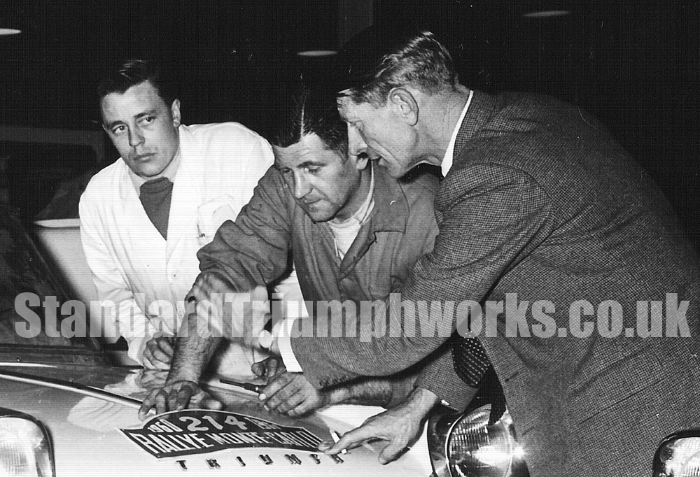 A series of close-up photographs during the 1960 Monte Carlo and Alpine Rally preparations for the Works Triumph Herald Coupés.