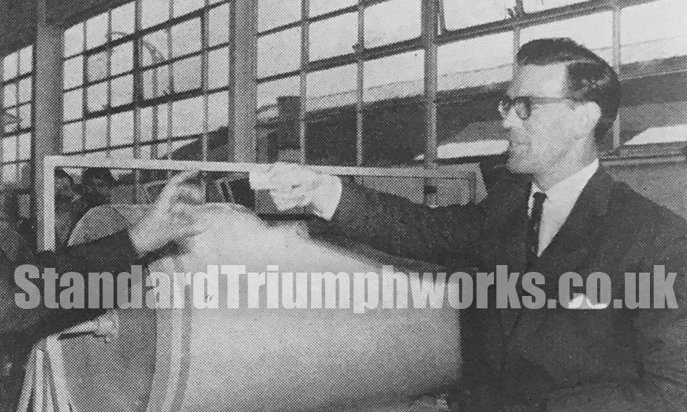 Mr Meeking can be seen collecting his Triumph Herald (centre) by Mr G. Durand, Standard Motors Branch of the British Legion President. Mr R Totterdell, Branch Secretary, is second from the left in the group.