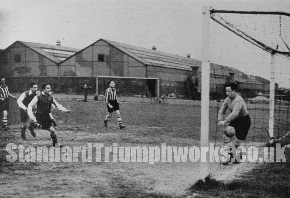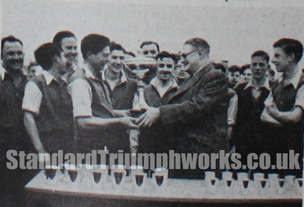 Mr. Alick Dick, Assistant Managing Director, kicked off before a considerable crowd which, despite the elements, vociferously encouraged the teams to greater efforts. Mr. Harold Weale, Production Director, presented the trophies to the teams after the game. Special mention must here be made of the refereeing throughout the Competition. In matches such as these, firm yet tactful handling of the games is even more necessary than usual, and the officiating which was performed by referees working at The Standard Motor Co. Ltd., was of the highest order.